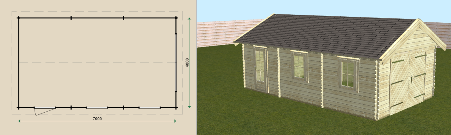 De totale afmeting van de houten garage zoals afgebeeld is (bxd) 650x400 cm. De totale hoogte is 350 cm. Het eersteklas vurenhout uit de Noordelijke landen (teruggedroogd tot 14-16%), heeft een wanddikte van 44mm. De wandhoogte is 240 cm.