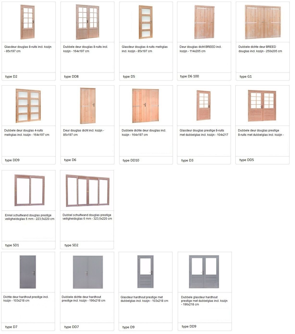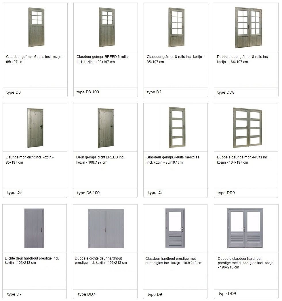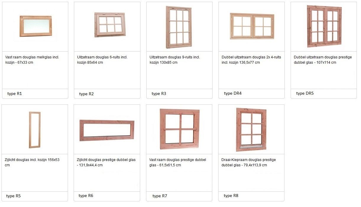 Onze tuinhuizen van Flexwood (pro-systeem) kunnen gefabriceerd worden in vuren keteldruk geimpregneerd, douglas hout en hardhout met een grijze grondlaag. Bekijk hieronder de mogelijke ramen en deuren in zowel douglas hout, vuren druk-geimpregneerd hout en hardhout in een grijze grondlaag.